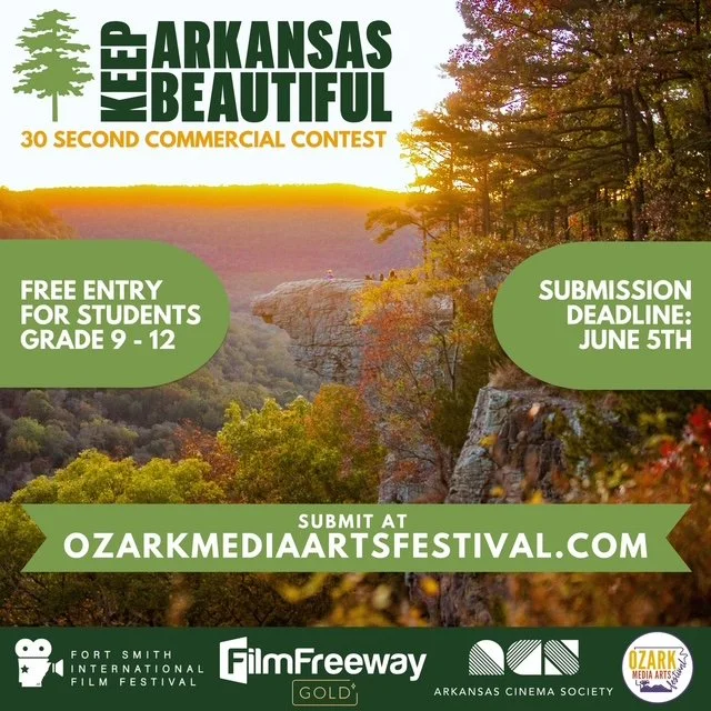 The Fort Smith International Film Festival, Ozark Media Arts Festival, Arkansas Cinema Society (ACS) and Keep Arkansas Beautiful Commission will host a statewide video contest for high school students (grades 9-12) to create a video commercial of 30 seconds or less that promotes environmental responsibility in Arkansas. The contest will run until June 5, 2026. Winners will be announced at an ACS Summer Screening. There is no fee to enter the contest.